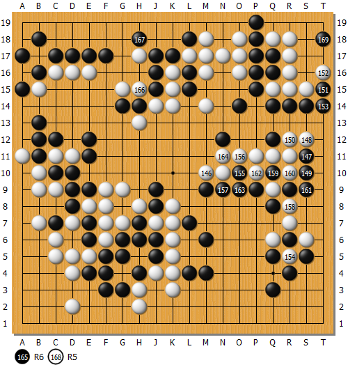 - 實戰白148、150從另一邊扳黏後,黑棋也151、153扳黏,白棋如果繼續於下圖1阻渡,則黑棋也可點入角上劫殺白棋。如此局面複雜,白棋也沒有自信。