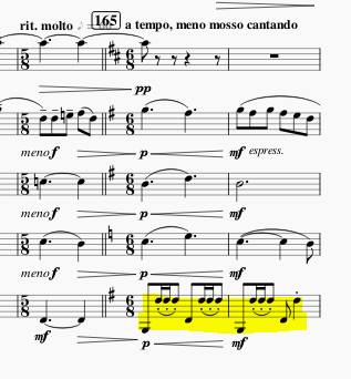 不過據說試吹時這樣的設定很失敗,變得音響效果很空。只好將這個旋律轉給第二部,還是讓低音單簧管回去當正反拍節奏組了。
