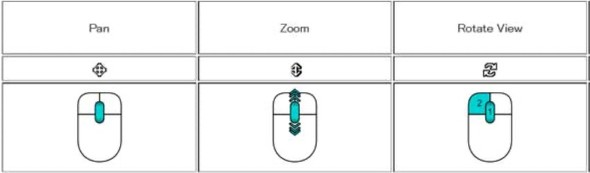 平移的話,就是按下滑鼠中鍵滾輪來拖曳;放大縮小的話,就是滑動中央的滾輪。而旋轉視角則是中央滾輪和左鍵同時按下、或是中央滾輪與右鍵一起按下再拖曳即可。