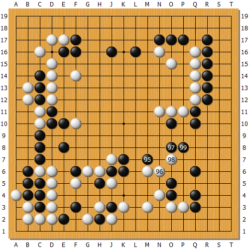 ◇ 白100、102扳粘,接下來還可以A夾碰,是此際最大官子。